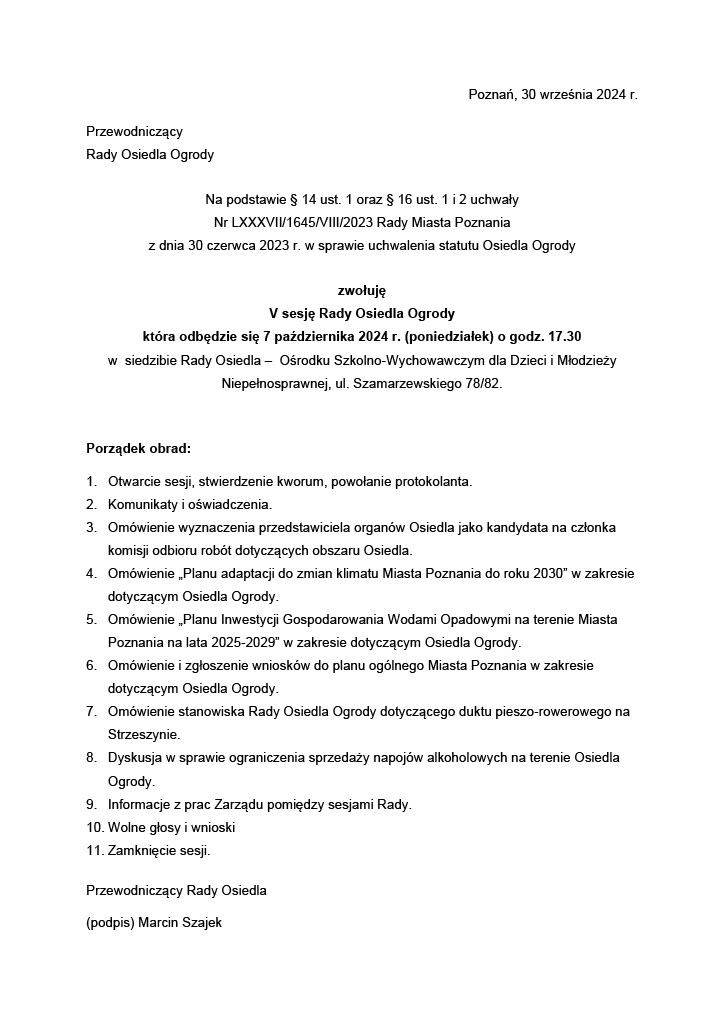 Przewodniczący Rady Osiedla Ogrody Marcin Szajek zwołuje V sesję Rady Osiedla Ogrody, która odbędzie się 7 października 2024 r. (poniedziałek) o godz. 17.30 w budynku Ośrodka Szkolno-Wychowawczego dla Dzieci i Młodzieży Niepełnosprawnej, ul. Szamotulska 67.
