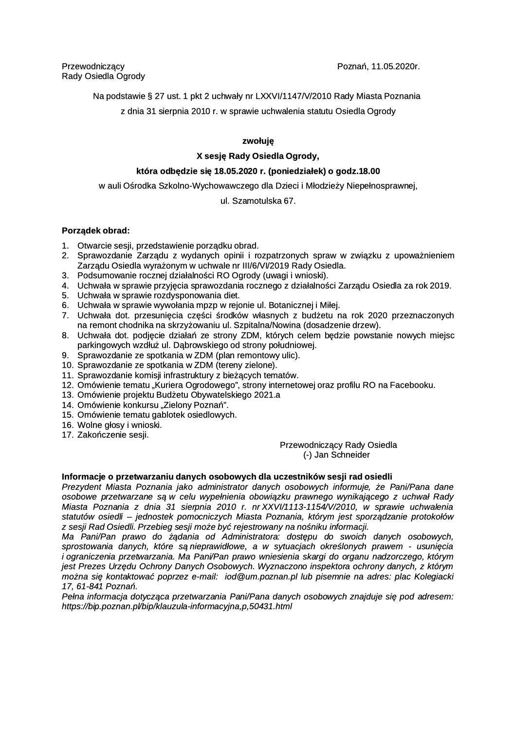 Przewodniczący Rady Osiedla Ogrody Jan Schneider zwołuje na dzień 18.05.2020 godz. 18:00 X Sesję Rady Osiedla Ogrody. Ze względu na obowiązujące rygory sanitarne w czasie pandemii  (konieczność zachowania bezpiecznej odległości), sesja odbędzie się w auli Ośrodka Szkolno-Wychowawczego dla Dzieci i Młodzieży Niepełnosprawnej, Poznań ul. Szamotulska 67.