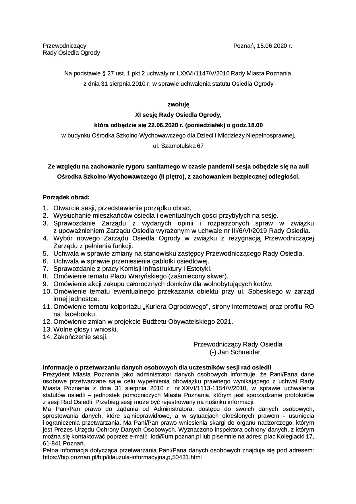 Przewodniczący Rady Osiedla Ogrody Jan Schneider zwołuje XI sesję Rady Osiedla Ogrody, która odbędzie się 22.06.2020 r. (poniedziałek) godz. 18:00 w budynku Ośrodka Szkolno-Wychowawczego dla Dzieci i Młodzieży Niepełnosprawnej, ul. Szamotulska 67.